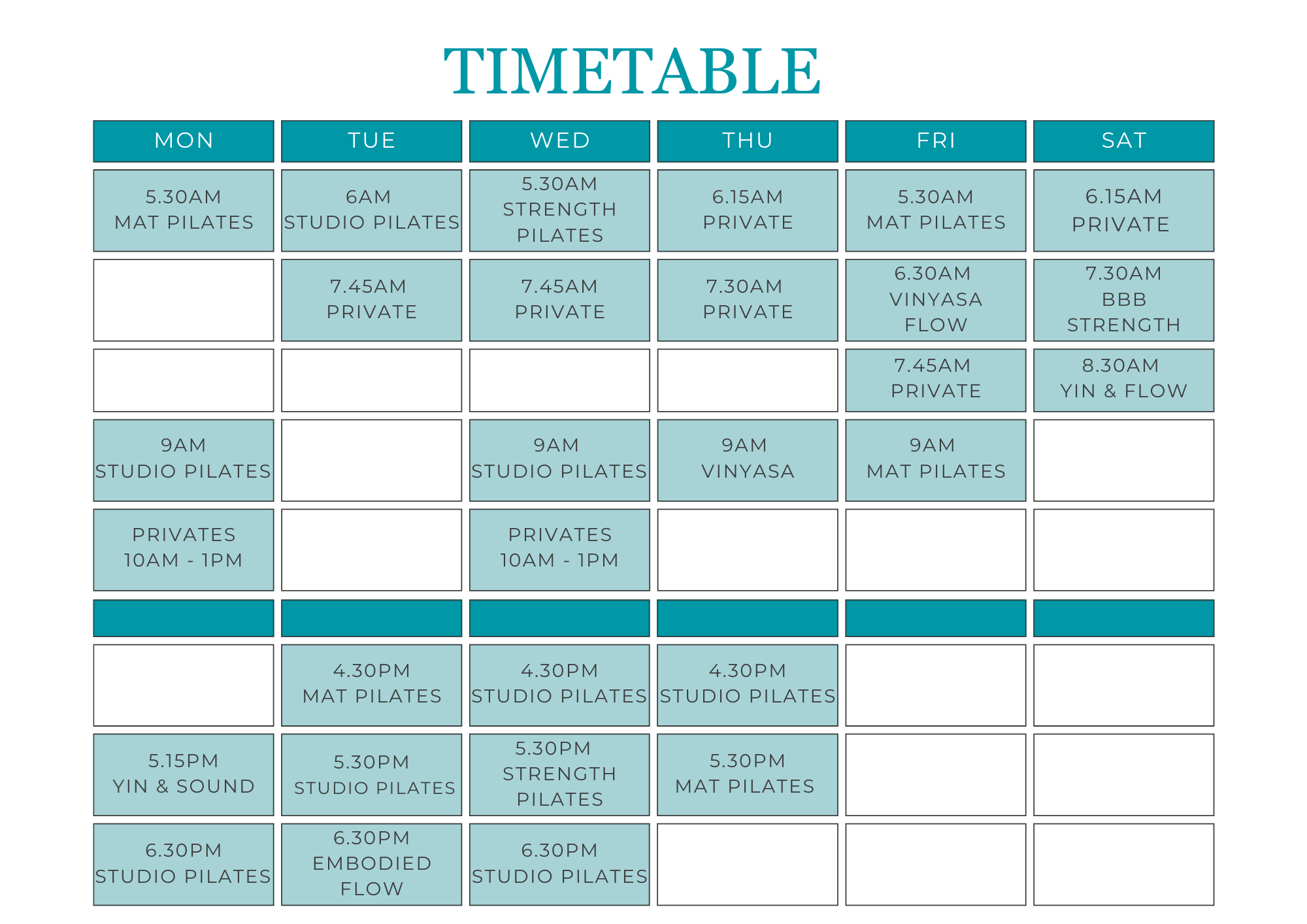 Private Class appointment are available upon request. Shown in the timtebable below are current bookings.